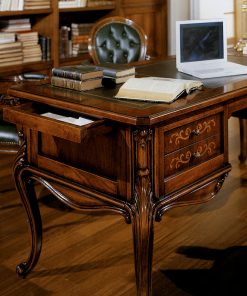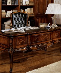 Письменный стол с выдвижными ящиками. Декорирован инкрустацией и резьбой. Возможны другие варианты отделки и обивки.