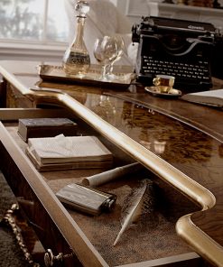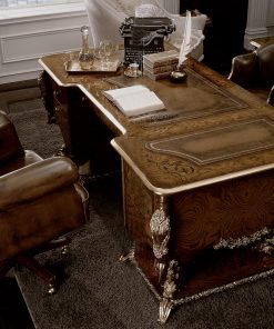 Письменный стол с 5 выдвижными ящиками. Декорирован инкрустацией и резьбой. Столешница обита вставками из кожи.