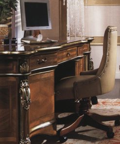Фигурный письменный стол с тремя выдвижными ящиками и модулями с распашными дверцами, декорирован инкрустацией и резьбой. Возможны другие варианты отделки
