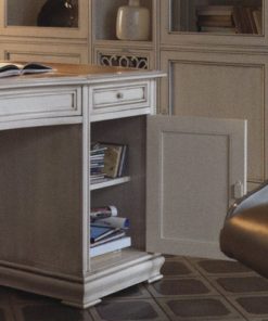 Фигурный письменный стол с выдвижными ящиками, модулем с распашной дверцей и обитой столешницей. Возможны другие варианты отделки и обивки
