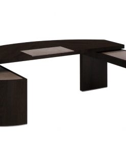 Письменный стол с фигурной столешницей, комодом с раздвижной дверцей и подставкой с выдвижным ящиком. Топ комода, подставки и центральная часть столешницы обтянуты кожей. Основание выполнено из металла. Возможны другие варианты отделки и обивки