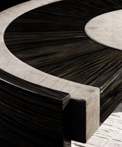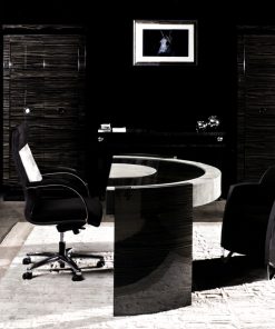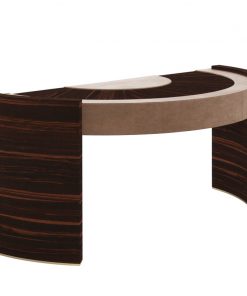 Закруглённый письменный стол с выдвижным ящиком. Детали столешницы обтянуты кожей. Основание выполнено из металла. Возможны другие варианты отделки и обивки