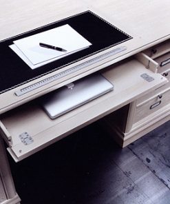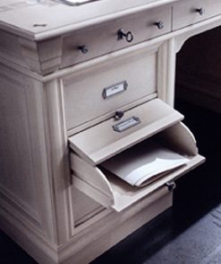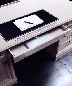 Письменный стол с тремя ящиками, кассетницей, отделением с жалюзи, столешницей с центральной вставкой из кожи, встроенными линейкой и контейнером для ручек. Возможны другие варианты отделки.