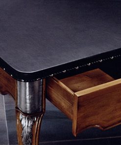 Письменный стол с двумя выдвижными ящиками и столешницей из кожи, декор из серебряной фольги, структура вишня. Возможен вариант с деревянной столешницей. Возможны другие варианты отделки.