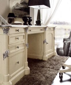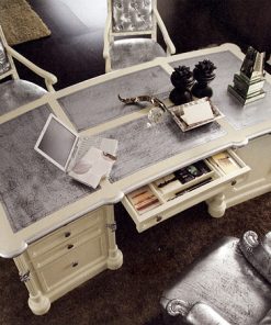 Письменный стол с 6 ящиками, 1 распашной дверцей , столешницей со вставками из кожи и декором из серебряной фольги. Возможны другие варианты отделки.