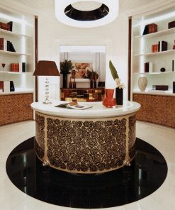 Полукруглый письменный стол. Декорирован инкрустацией и росписью. Возможны другие варианты отделки.