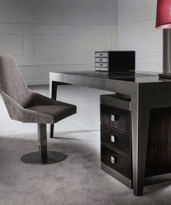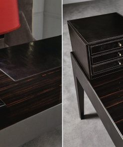 Письменный стол с металлическим основанием, деревянной столешницей с кожаной вставкой, тумбой с тремя выдвижными ящиками в кожаной обивке и маленькой настольной тумбой с ящиками. Ручки выполнены из мрамора. Возможны другие варианты отделки и обивки