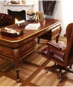 Письменный стол с 7-ю ящиками. Столешница — кожа. Декорирован резьбой. Возможны различные варианты отделки (ясень, клен, тюльпанное дерево, груша и т.д.).