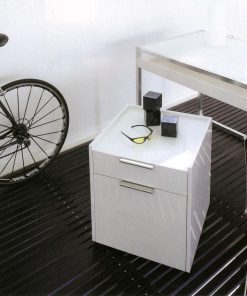 Письменный стол с 1-м ящиком и тумбочкой. Тумбочка с 2-мя ящиками. Столешница выполнена из матового стекла. Варианты отделки: белый глянцевый или эбен.