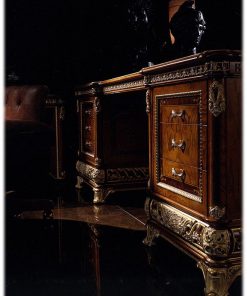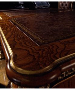 Письменный стол с 6-ю ящиками, столешница выполнена в отделке из кожи. Декорирован резьбой ручной работы. Отделка ясень крашенный в светлый или темный орех.