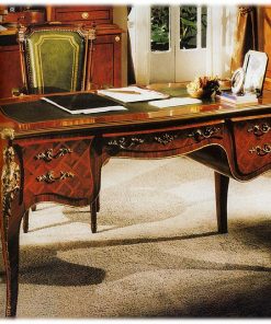 Письменный стол с 5-ю ящиками, декорированный резными позолоченными элементами. Столешница покрыта кожей. Структура — розовое дерево. Возможен вариант отделки без позолоты по периметру столешницы и другой цвет кожи