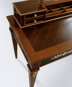 Письменный стол с выдвижными ящиками и стеклянной откидной дверцей. Декорирован инкрустацией и металлическими элементами. Возможны другие варианты отделки.