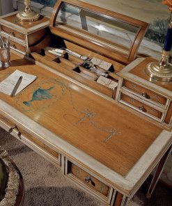 Письменный стол с откидной стеклянной дверцей и выдвижными ящиками. Декорирован росписью. Возможны другие варианты отделки.