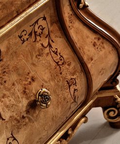 Письменный стол с девятью выдвижными ящиками. Декорирован инкрустацией и резьбой. Столешница обита кожей