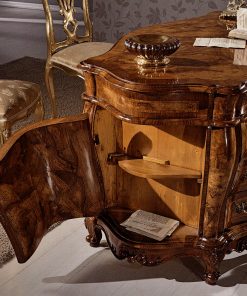 Письменный стол с девятью выдвижными ящиками и четырьмя распашными дверцами расположенными по бокам стола и с внешней стороны. Декорирован икрустацией и резьбой