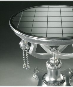 Круглая подставка, декорирована подвесками. Столешница выполнена из зеркала, также можно выполнить из черного или перламутрового стекла. Возможны друие варианты отделки.
