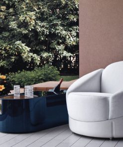 Подставка с металлизированным каркасом из стекловолокна. Декорирована круглой полкой из глянцевого красного дерева с инкрустацией из белого клёна. Предназначена для использования вне помещений. Сбоку имеется подставка для бутылок. Возможен вариант полки в обивке из ткани. Возможны другие варианты отделки