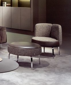 Обитый круглый пуф с металлическими ножками. Возможны другие варианты обивки, в том числе в ткани клиента.