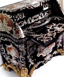 Секретер с 3 выдвижными ящиками и 1 откидной дверцей. Украшен инкрустацией и резьбой. ручной работы. Возможны другие варианты отделки.