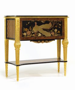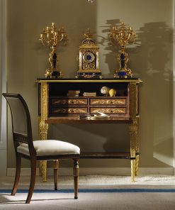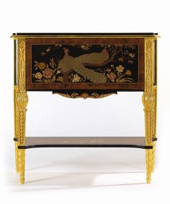 Секретер с откидной дверцей и полкой. Декорирован инкрустацией и резьбой. Оснащён четырьмя выдвижными ящиками. Возможны другие варианты отделки