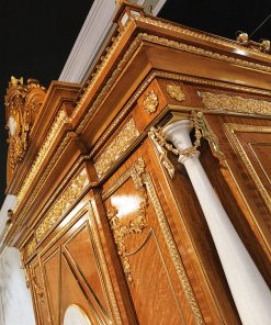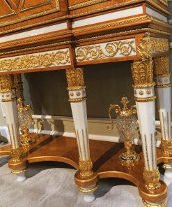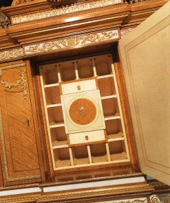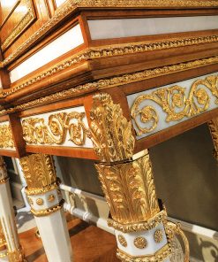Секретер с тремя распашными дверцами и декоративными элементами из стекла. Оснащён выдвижными ящиками и полками. Декорирован инкрустацией, резьбой, вставками из мрамора и розового кварца. Возможны другие варианты отделки
