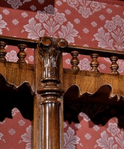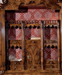 Секретер с четырьмя выдвижными ящиками, двумя распашными и одной откидной дверцами. Декорирован резьбой. Распашные дверцы выполнены из стекла. Внутри секретер оснащён маленькими выдвижными ящиками и распашными дверцами. Задняя панель обита тканью