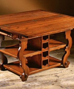 Раскладной сервировочный столик с 3-мя ящиками, подставками для бутылок и бокалов, 2 полки в центре выдвигаются превращаясь в поднос. Декорирован инкрустацией ручной работы. Возможны другие варианты отделки.