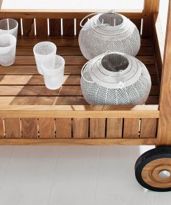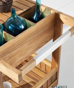 Сервировочный столик на колёсиках. Столешница оборудована отделениями для бутылок. Каркас выполнен из тикового дерева, детали конструкции выполнены из металла