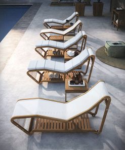 Шезлонг с колёсиками и подставкой для полотенец. Каркас выполнен из тикового дерева и обтянут тканью, детали конструкции выполнены из металла. Возможны другие варианты обивки. Дополнительно можно заказать подушки сиденья и спинки