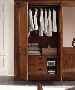 Шкаф с 4 распашными дверцами, с двумя зеркальными вставками. Внутреннее оснащение: полка, комод с ящиками и вешалка для одежды.