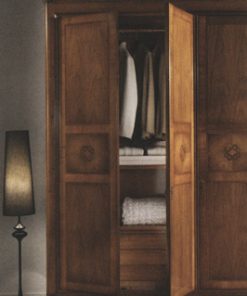 Шкаф с пятью распашными дверцами, декорирован инкрустацией. Включает в себя внутренний комод, полки и вешалки. Возможны другие варианты отделки
