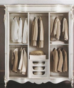 Шкаф с тремя распашными дверцами, декорирован резьбой и росписью. Включает в себя внутренний комод, полки и вешалки. Возможны другие варианты отделки