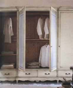 Шкаф с четырьмя распашными дверцами и выдвижными ящиками, декорирован стеклянными вставками и резьбой. Включает в себя внутренний комод, полки и вешалки. Возможны другие варианты отделки