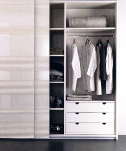 Шкаф с 2 раздвижными дверьми со смягчителем и лакированным стеклом. Внутренняя кассетница с 3 деревянными выдвижными ящиками. Возможны другие варианты отделки.