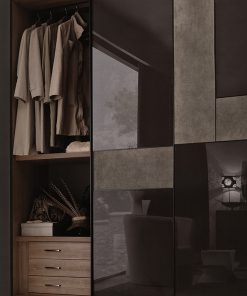 Шкаф с раздвижными стеклянными дверцами. Возможны другие варианты отделки и обивки.