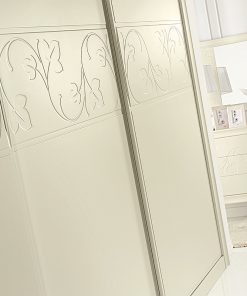 Шкаф с тремя раздвижными дверцами. Декорирован рельефными узорами. Включает в себя внутренний комод с тремя выдвижными ящиками, штанги. Возможны другие варианты отделки