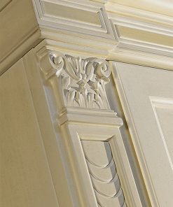 Шкаф с двумя раздвижными дверцами. Декорирован росписью и резьбой. Включает в себя внутренний комод с тремя выдвижными ящиками, штанги, полки. Возможны другие варианты отделки