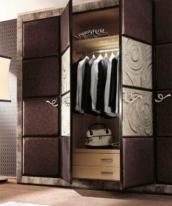 4-х дверный шкаф. Внутренне оснащение: тумба с 2-мя ящиками, 3 полки, 5 штанг. Двери декорированы стеклом и кожей. Возможны другие варианты отделки.