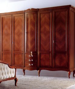Шкаф с пятью распашными дверцами и тремя выдвижными ящиками. Украшен резьбой. Возможны другие варианты отделки.
