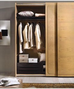 Шкаф с 2-мя раздвижными дверцами. Стандартное внутреннее оснащение 2 полки и 4 штанги, в дополнение можно заказать тумбы. Возможны другие варианты отделки.