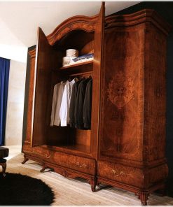4-х дверный шкаф с 3-мя ящиками внизу. Стандартное внутреннее наполнение: 3 полки, 5 штанг. Декорирован резьбой. Возможны различные варианты отделки (ясень, клен, тюльпанное дерево, груша и т.д.).