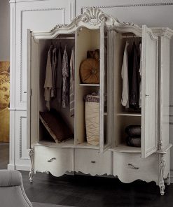 Шкаф с 3 выдвижными ящиками, 2 деревянными и 1 зеркальной распашными дверцами. Декорирован резьбой. Возможны другие варианты отделки.