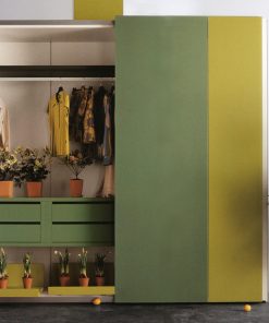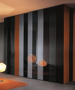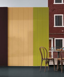 Пример композиции модульного шкафа с четырьмя распашными дверцами. По желанию заказчика шкаф может быть с распашными или раздвижными дверцами, состоять из вертикальных полос разной длины и цвета