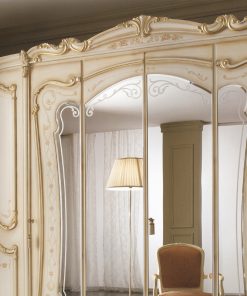 Шкаф с шестью распашными дверцами и четырьмя зеркалами. Декорирован росписью и резьбой. Включает в себя внутренний комод с тремя ящиками, три полки и пять вешалок. Возможны варианты шкафов с четырьмя и двумя дверцами