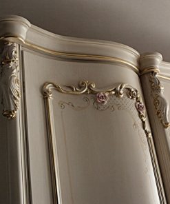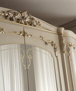 Шкаф с четырьмя распашными дверцами и двумя зеркалами. Декорирован цветочными украшениями, росписью и резьбой. Включает в себя внутренний комод с тремя ящиками, три полки и пять вешалок. Возможен вариант шкафа с тремя дверцами