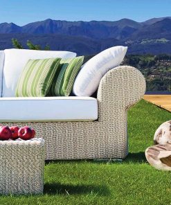 Плетёная трёхместная софа с мягким сиденьем и спинкой. Ножки выполнены из металла. Возможны другие варианты отделки и обивки