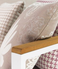 Софа с мягким сиденьем и спинкой. Каркас выполнен из металла, подлокотники — из тикового дерева. Возможны другие варианты отделки и обивки