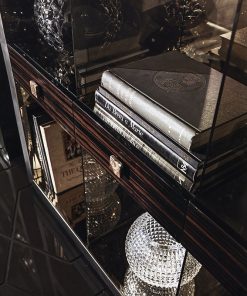 Стеллаж с тремя открытыми полками и шестью выдвижными ящиками с мраморными ручками. Рама выполнена из металла. Оснащён зеркальной задней панелью и шестью стеклянными разделителями. Возможен вариант сталлажа без задней панели. Возможны другие варианты отделки