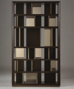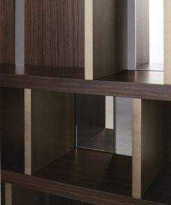 Стеллаж с шестью открытыми полками. Основание и разделители на полках выполнены в отделке из металла. Задние панели декорированы зеркальными вставками. Возможны другие варианты отделки