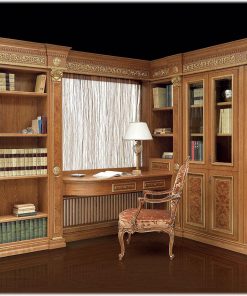 Модульная стенка с письменныйм столом, с открыми и закрытыми полками. Размеры стенки выполняются по проекту клиента. Декорирована резными элементами ручной работы. Возможны другие варианты отделки.